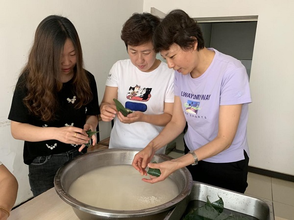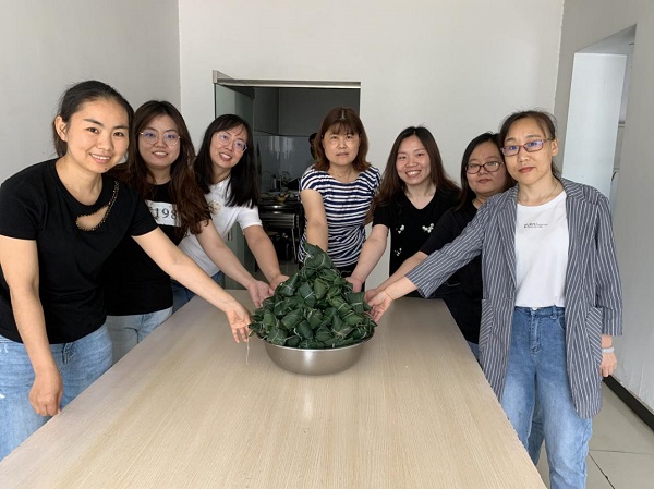 上午9點(diǎn),粽葉、糯米、大棗整齊地擺上桌。大家邊包邊聊,其樂(lè )融融。在包粽子現場(chǎng),熟悉包粽子的能手們飛快地拿起粽葉,兩手一窩卷成漏斗狀,填米、加棗、壓緊、扎繩,一氣呵成。她們還充當起“老師”的角色,教“新手”職工包粽子,手把手現場(chǎng)教學(xué),“老師”教得仔細,“學(xué)生”學(xué)得認真,但要做出餡料十足、外觀(guān)漂亮的粽子還是需要費一番功夫的。隨著(zhù)技巧的不斷嫻熟,一個(gè)多小時(shí)的時(shí)間,形狀各異、大小不一的一百多個(gè)粽子就堆積成山了,預算科副科長(cháng)竇夢(mèng)娜說(shuō):“我們包粽子的水平真是越來(lái)越高了,明年再包會(huì )更好!”此時(shí)每個(gè)人心里都洋溢著(zhù)一股喜悅之情,有初學(xué)一門(mén)手藝的欣喜,有參與集體活動(dòng)交流感情的滿(mǎn)足。
