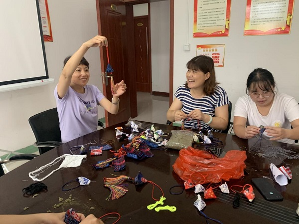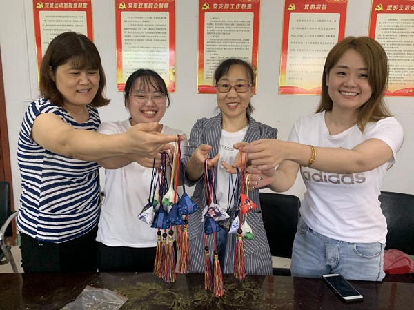 在傳統習俗中,玲瓏可愛(ài)的各色香包也是端午節必不可少的元素。包完粽子后大家轉移陣地到了活動(dòng)室,大家圍坐桌邊,面前堆放著(zhù)一份份材料包,有棉布、艾草、針線(xiàn)、中國結流蘇。面對這個(gè)從來(lái)沒(méi)有做過(guò)的DIY,大家開(kāi)始研究起來(lái),有的用手機搜索縫制方法流程,有的直接比來(lái)比去親自摸索著(zhù)縫起來(lái)。有職工說(shuō):“這有點(diǎn)像咱們小時(shí)候老人們縫的毽子,那個(gè)里面裝的是五谷雜糧,咱們現在裝的是艾草?!薄斑@香囊可以?huà)煸谵k公室或者車(chē)上,有清香、驅蚊的功效?!薄拔宜闶侵懒?,這個(gè)流蘇應該縫在這個(gè)邊的中間,而不是角上……”大家你一句我一句,手中的針線(xiàn)穿梭在棉布間,用密密的針腳縫制出傳統佳節最好的注解,用絲絲線(xiàn)線(xiàn)纏繞出端午安康的美滿(mǎn)寓意,一個(gè)個(gè)精巧可愛(ài)的三角香囊在大家的努力下完美呈現。