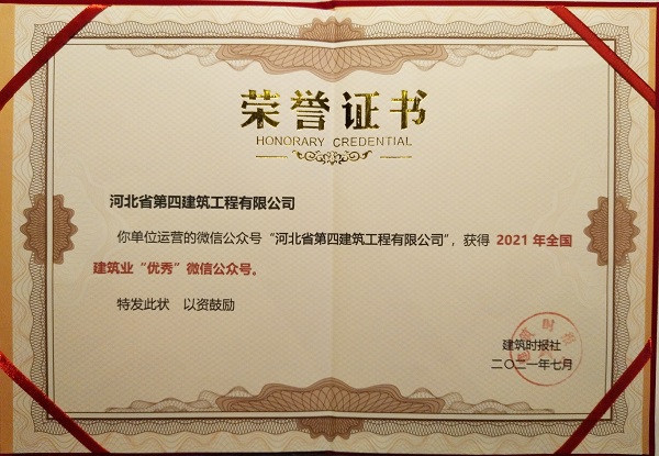 7月16日,在“2021建筑業(yè)微信公眾號運維經(jīng)驗交流研討會(huì )暨全國建筑業(yè)優(yōu)秀公眾號頒獎典禮”上,公司微信公眾號“河北省第四建筑工程有限公司”被評為“2021年全國建筑業(yè)優(yōu)秀微信公眾號”。