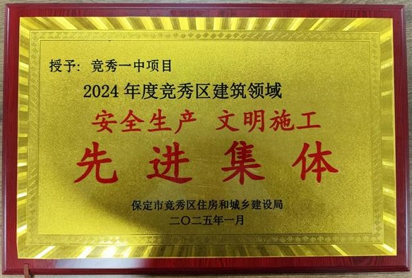 2025年1月14日,在保定市競秀區住房和城鄉建設局舉辦的2024年度總結表彰大會(huì )上,六分公司競秀一中項目部被授予“安全生產(chǎn)文明施工先進(jìn)集體”榮譽(yù)稱(chēng)號。